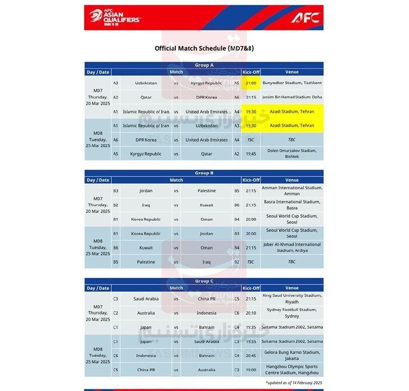 با اعلام کنفدراسیون فوتبال آسیا و تأیید ناظران AFC، مسابقات تیم ملی فوتبال ایران مقابل امارات (30 اسفند 1403) و ازبکستان (5 فروردین 1404) در استادیوم آزادی برگزار خواهد شد.