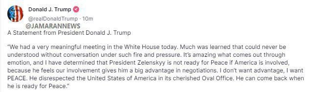 ساعاتی پیش ویدئویی منتشر شد که در آن دونالد ترامپ در کاخ سفید به شدت از زلنسکی رئیسجمهور آمریکا انتقاد و به او توهین کرد. بعد از این دیدار ترامپ در مطلبی در شبکه اجتماعی خودش، «تروث سوشال» نوشت: زلنسکی آماده صلح نیست. او به آمریکا توهین کرد. او هر وقت آماده صلح بود می تواند برگردد.