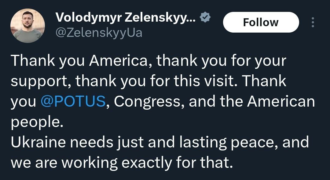 زلنسکی بعد از خروج از کاخ سفید و یا آنجه اخراج او از این ساختمان بعد از جدال لفظی با ترامپ عنوان شده است در متنی در شبکه اجتماعی ایکس نوشت: از ایالات متحده برای حمایتش، متشکرم برای این دیدار. تشکر از ترامپ، کنگره و مردم آمریکا. اوکراین به یک صلح عادلانه و پایدار نیاز دارد و ما دقیقاً برای آن تلاش می کنیم.