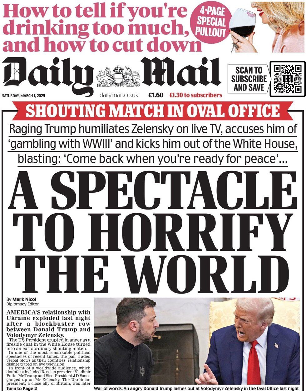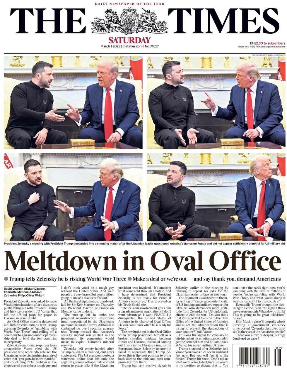 تایمز با انتخاب تیتر «فاجعه در دفتر بیضی»، تصاویر متعددی از مشاجره شدید میان ترامپ و زلنسکی را منتشر کرده است. رسانه ایندیپندنت نیز زلنسکی را فردی غافلگیرشده توسط ترامپ توصیف کرده و به انتقادات تند ترامپ و سناتور جیدی وانس از رئیسجمهور اوکراین اشاره کرده است.
