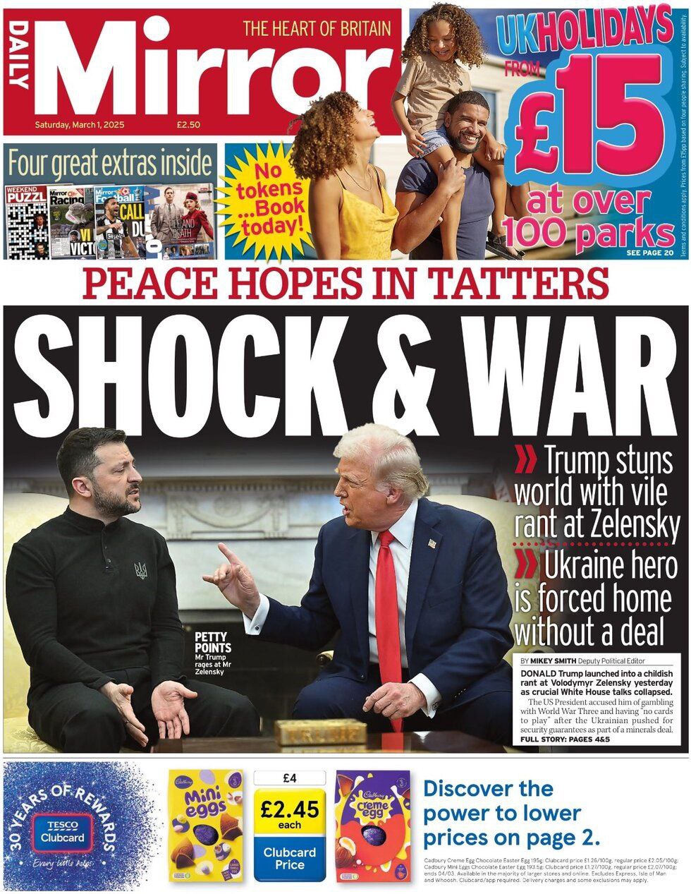 دیلی اکسپرس با تیتر «شکست مذاکرات صلح، ترامپ را در بحران قرار میدهد»، به اتهامات خشمگینانه رئیسجمهور آمریکا علیه زلنسکی پرداخته است. دیلی میل از «مشاجره لفظی در دفتر بیضی» و اتهامات ترامپ مبنی بر اینکه زلنسکی با جنگ جهانی سوم قمار میکند، گزارش داده است.