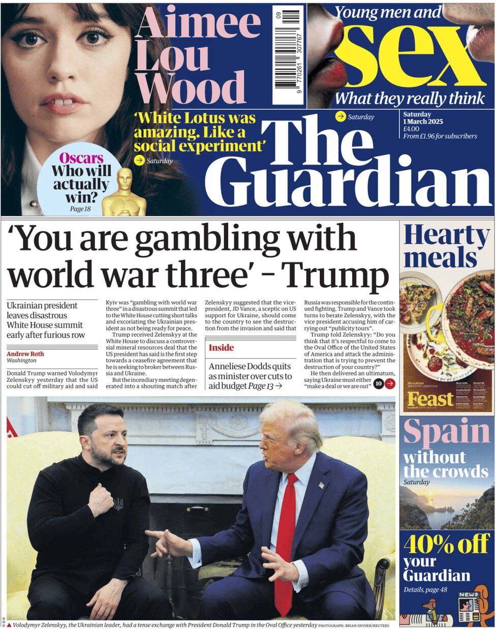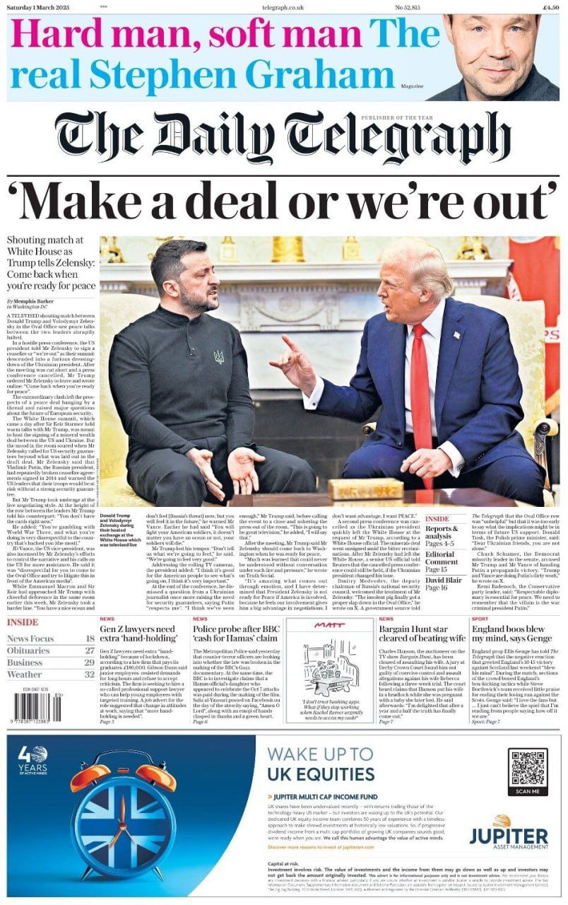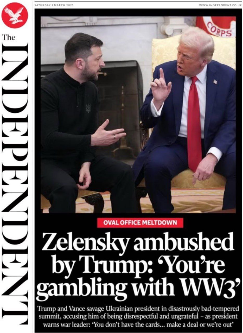 رسانه دیلی تلگراف نیز با تیتر «معامله کن یا میرویم بیرون»، اولتیماتوم ترامپ به زلنسکی را برجسته کرده است. روزنامه گاردین هم بر گفته زلنسکی مبنی بر اینکه ترامپ با جنگ جهانی سوم قمار میکند تأکید دارد.