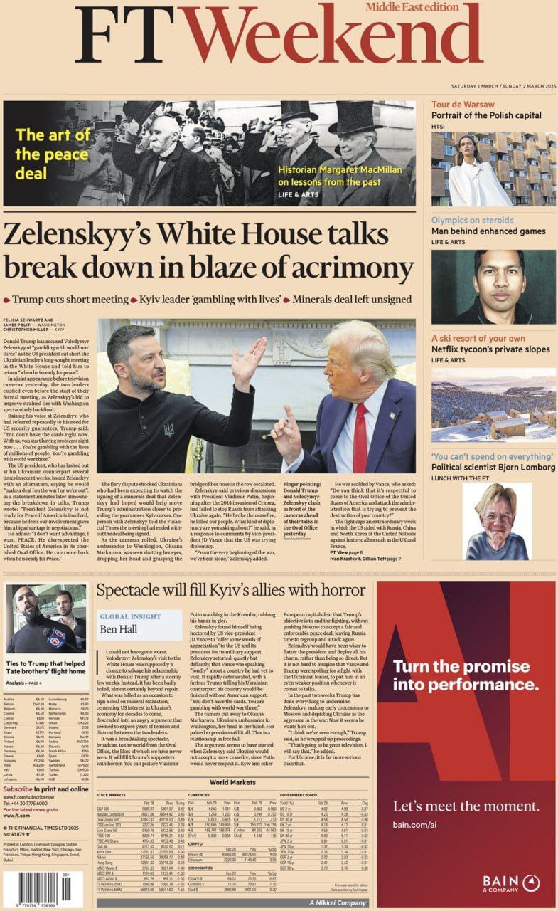 تنش بین دونالد ترامپ و ولادیمیر زلنسکی در دفتر کاخسفید از دیروز در رسانههای جهان بازتاب گستردهای داشته است. به طور مثال فایننشال تایمز بر شکست مذاکرات صلح در بحبوحه یک مشاجره شدید تمرکز دارد و به کوتاهی ملاقات ترامپ، قمار خطرناک زلنسکی و یک قرارداد معدنی امضا نشده اشاره میکند.