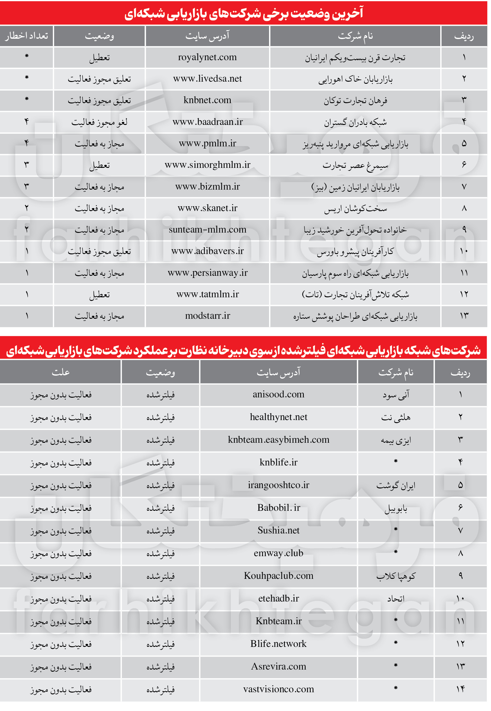 بررسی آمارهای مربوط به کسبوکارهای دارای مجوز از سوی دبیرخانه نظارت بر عملکرد شرکتهای بازاریابی شبکهای و کسبوکارهای مجازی نشان میدهد که تاکنون حدود 32 شرکت در سایت این مجموعه نظارتی با عنوان «شرکتهای بازاریابی شبکهای» به ثبت رسیدهاند. این شرکتها شامل مجموعههای فعال، غیرفعال، تعلیقی یا تعطیل هستند و برخی از آنها نیز مجوزشان لغو شده است. طبق اطلاعاتی که خبرنگار «فرهیختگان» جمعآوری کرده، شرکتهایی مانند تجارت قرن بیستویکم، سیمرغ عصر تجارت و شبکه تلاش آفرینان تجارت (تات) تعطیل شدهاند. از سوی دیگر، شرکت شبکه بادران گستران که مردم آن را بیشتر با نام بادران میشناسند، به دلیل تخلفات متعدد، مجوز فعالیت آن لغو شده است.