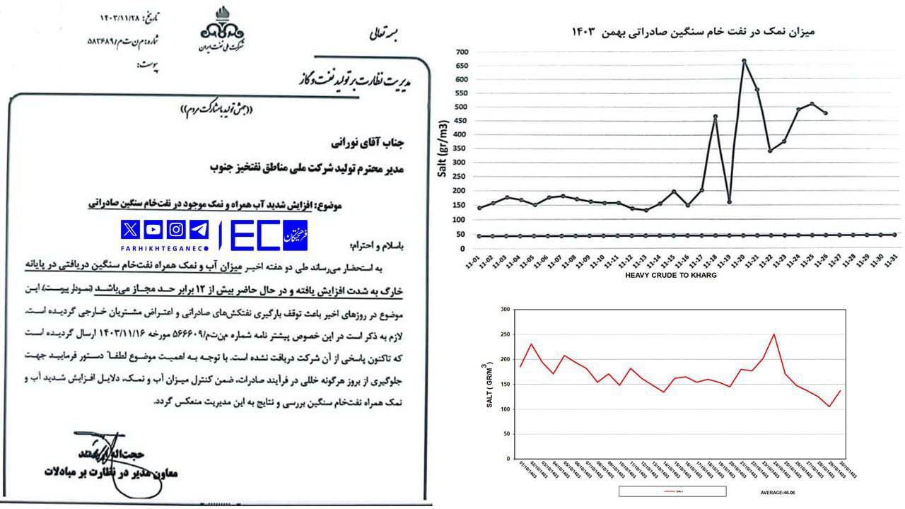 طبق اسناد، در سه ماه آذر تا بهمن امسال، کیفیت نفت تولیدی در مناطق نفتخیز جنوب کاهش یافته و میزان آب نمک همراه نفت خام دریافتی در پایانه خارک بیش از ۱۲ برابر حد مجاز شده است.