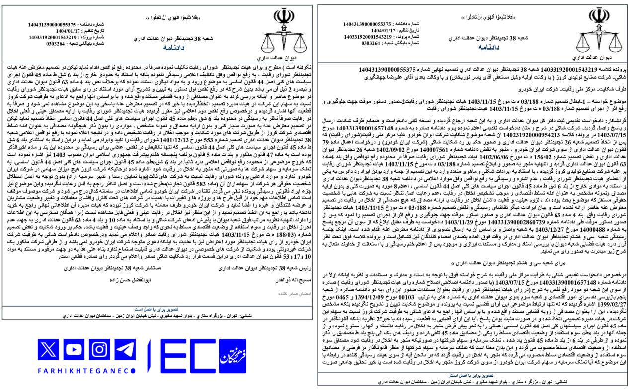 پس از ابلاغ رای شورای رقابت و اعتراض شرکت کروز، دیوان عدالت اداری حکم هیات تجدیدنظر مبنی بر غیرقانونی بودن حضور کروز در هیات مدیره ایرانخودرو را تا بررسی نهایی متوقف کرد و حال یک ماه و نیم پس از این تعلیق، حکم نهایی صادر شد.