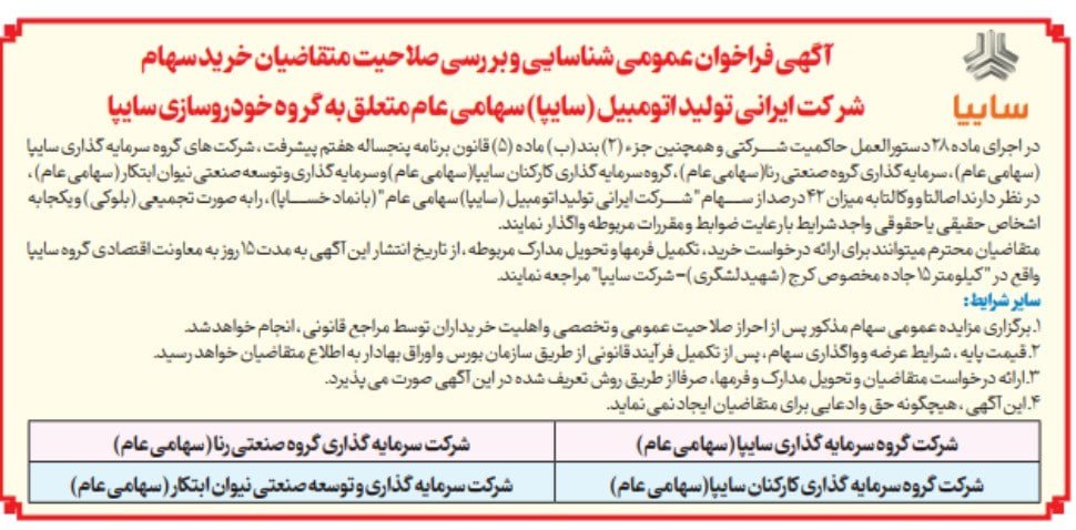 اعلام آمادگی سایپا برای خصوصیسازییک شرکت سرمایه گذاری با انتشار فراخوان مزایده از فروش ۴۲ درصد از سهام شرکت سایپا (با نماد خساپا) خبر داد.