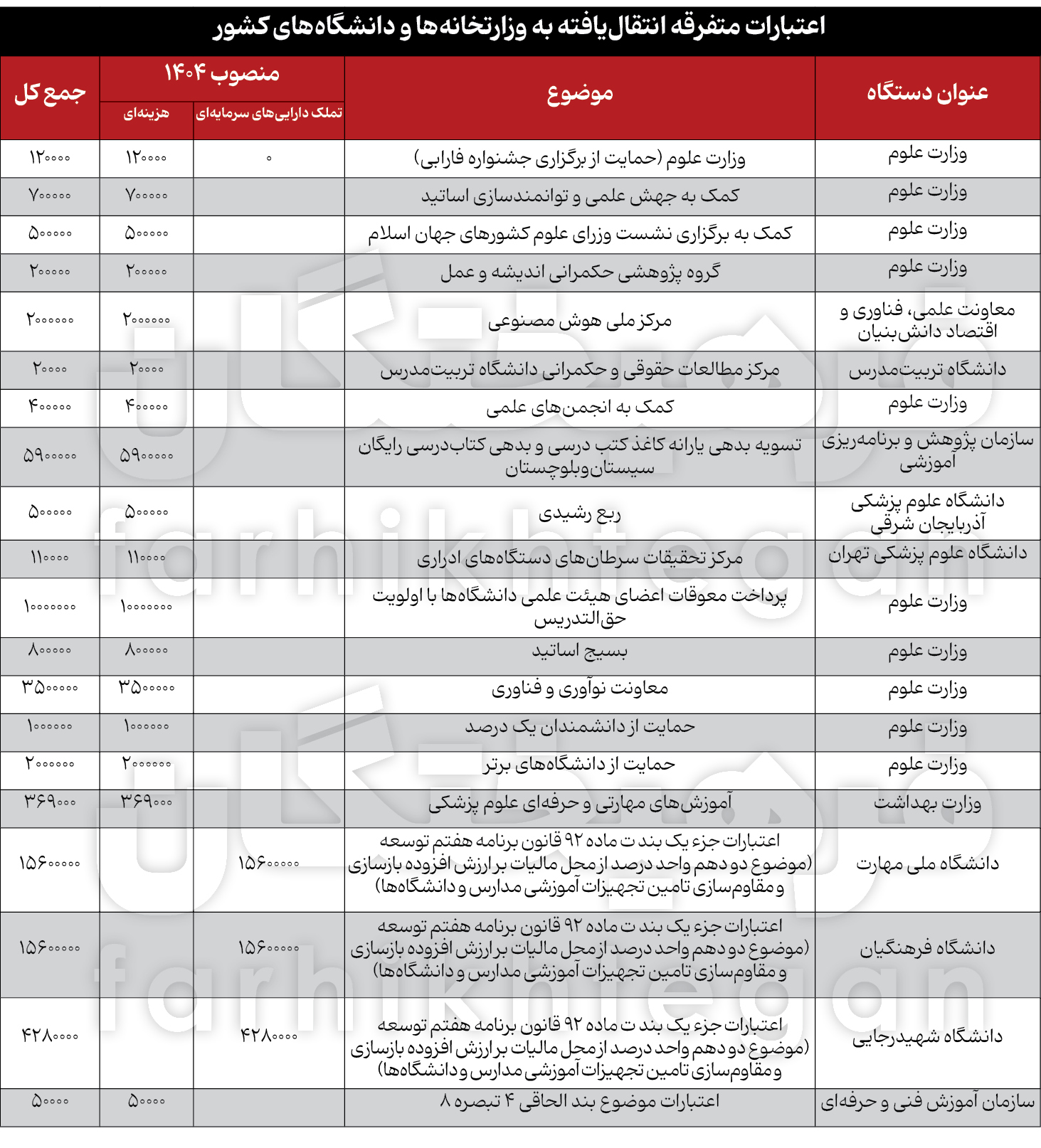 در این میان دانشگاههای ملی مهارت و فرهنگیان هرکدام قرار است یک هزار و 560 میلیارد تومان اعتبار برای بازسازی و مقاومسازی تأمین تجهیزات آموزشی مدارس و دانشگاهها دریافت کنند. دانشگاه تربیت دبیر شهید رجایی نیز در همین راستا 428 میلیارد تومان اعتبار میگیرد که مربوط به جزء بند یک ماده 92 قانون برنامه هفتم میشود. همچنین دانشگاه علوم پزشکی تهران هم از اعتبار 11 میلیارد تومانی برای راهاندازی مرکز تحقیقات سرطانهای دستگاه ادراری برخوردار شده و در ساحت کلانتر وزارت بهداشت بودجه 37 میلیارد تومانی دریافت میکند تا از آن برای ارائه آموزشهای مهارتی و حرفهای علوم پزشکی بهره بگیرد.