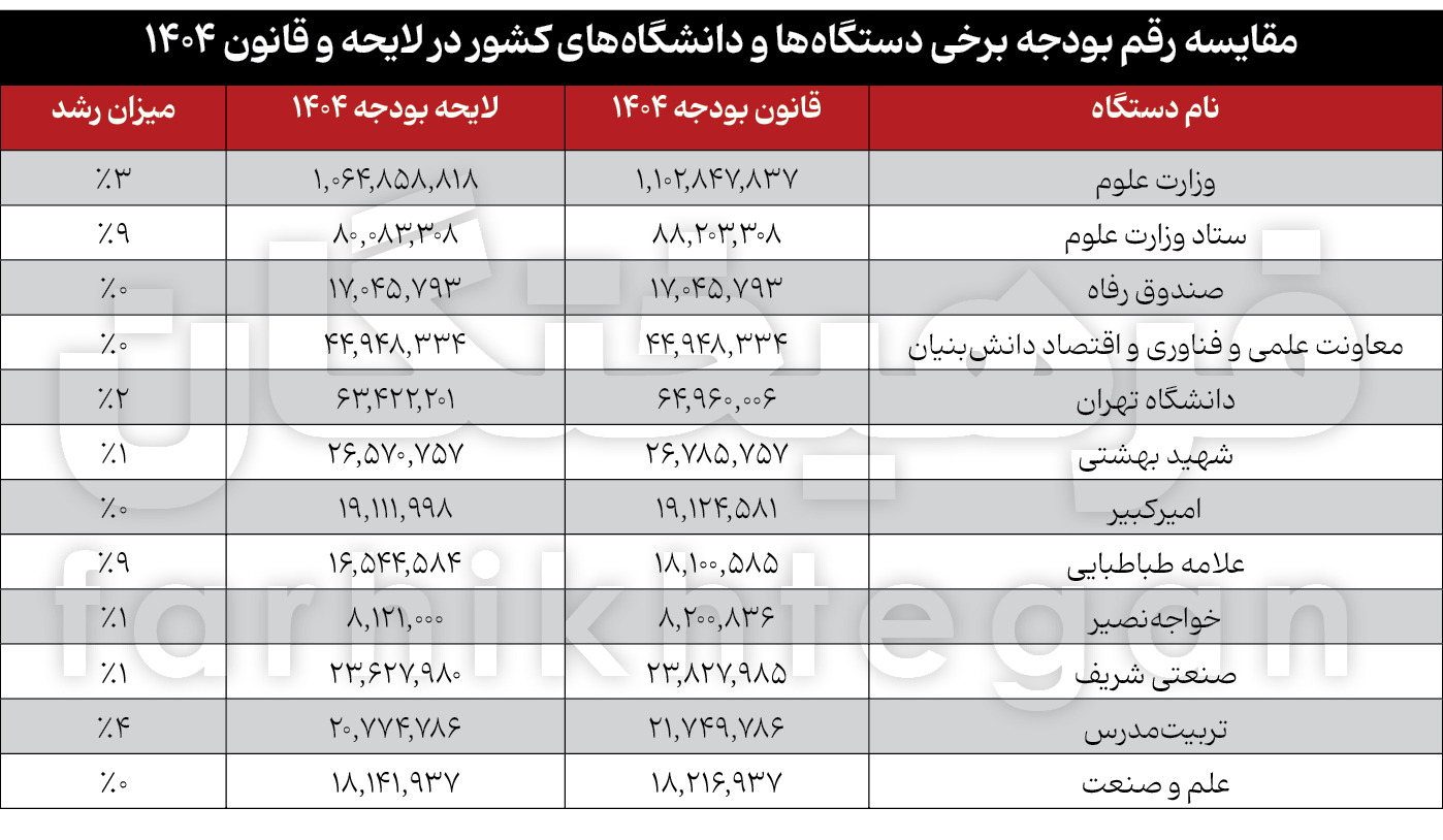 نگاهی به وضعیت 10 دانشگاهی که بیشترین رشد بودجه را در لایحه 1404 داشتند هم نشان میدهد که بیشترین میزان رشد بودجه برای دانشگاه علامه طباطبایی رقم خورده و این دانشگاه با رشد 9 درصدی بودجه، قرار است 156 میلیارد تومان بیشتر از لایحه اعتبار داشته باشد. بعد از آن، دانشگاه تربیت مدرس رشد 4 درصدی دارد که معنایش افزایش اعتبار 97 میلیارد تومانی آن نسبت به لایحه بودجه است. رتبه سوم هم به دانشگاه تهران میرسد که اعتبار آن با رشد 2 درصدی، 154 میلیارد تومان بیشتر شده است. این میزان برای دانشگاه شهید بهشتی با رشد یک درصدی، 21 میلیارد تومان افزایش یافته است.