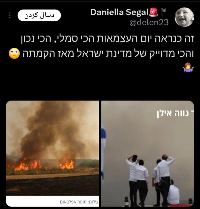 همچنین یک صهیونیست دیگر نیز در واکنش به این آتش سوزی در مراسم روز استقلال نوشت: این وضعیت که شاهد آن هستید، احتمالاً نمادینترین، درستترین و دقیقترین روز استقلال اسرائیل از زمان تأسیس آن است.