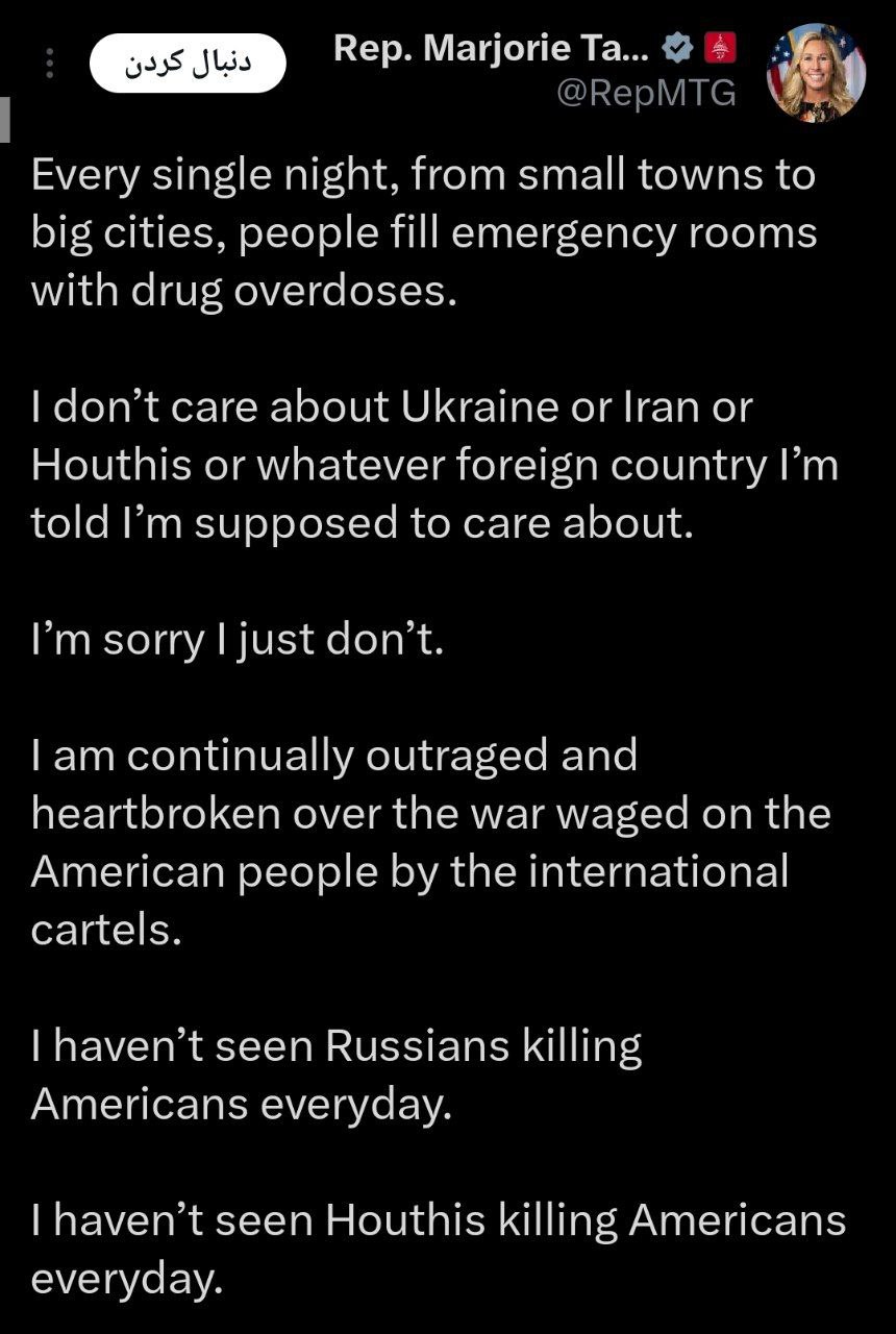 او نوشت: کارتلها هر روز جان آمریکاییها را میگیرند، در حالیکه فجایع انسانی مثل قاچاق کودکان از مرزها همچنان ادامه دارد. سؤال اینجاست: چطور میشود نسبت به رنج شهروندان خود بیتفاوت باشی، اما در امور کشورهای دیگه دخالت کرد؟ سیاست «اول آمریکا» نباید یک شعار باشد، بلکه باید محور اصلی تصمیمگیریهای داخلی و خارجی ما باشد.