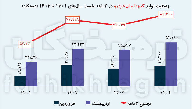 برخلاف افت چشمگیر تولید در گروه سایپا، نگاهی به دادههای ماهانه گروه ایرانخودرو از رشد تولید در این گروه خبر میدهد. براساس دادههای ایرانخودرو، تولیدات گروه در دوماهه نخست امسال به 83 هزار و 410 دستگاه رسیده که نسبت به مدت مشابه سال گذشته رشد 15.7 درصدی داشته است. همچنین تولید 83 هزار و 410 دستگاهی امسال درحالی است که این تعداد در دوماهه نخست سالهای 1403 ،1402 و 1401 به ترتیب 72 هزار و 69 دستگاه، نزدیک به 78 هزار دستگاه و 52 هزار و 130 دستگاه بوده است.