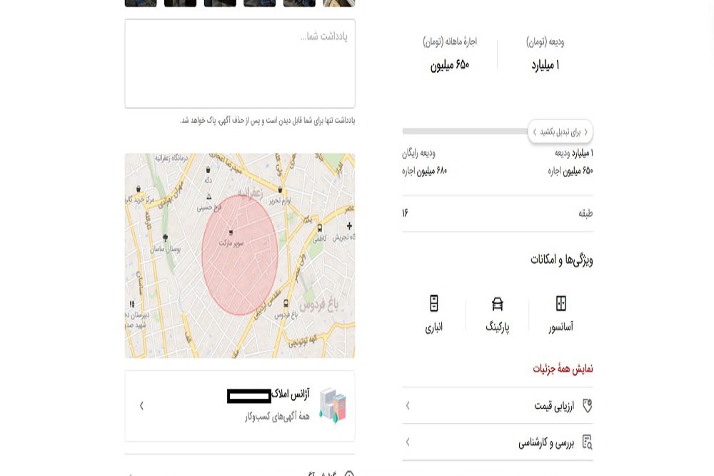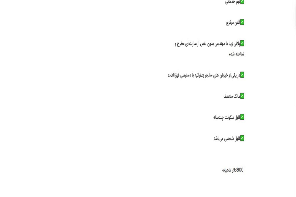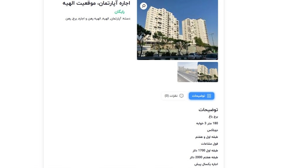 بهتازگی یکی از دفاتر مشاور املاک زعفرانیه نیز در وبسایت رسمی خود، آگهی منتشر کرده که در آن اجاره آپارتمانی در برجباغی واقع در الهیه، به دلار محاسبه شده است.در این آگهی، اجاره طبقه اول این واحد ۱۸۰ متری سهخوابه در محدوده الهیه، ۱۷۰۰ دلار و اجاره طبقه هفتم ۲۰۰۰ دلار در ماه اعلام شده است. همچنین قید شده که قرارداد بهصورت «اجاره یکساله پیش» منعقد خواهد شد؛ اصطلاحی که نشان میدهد مالک خواهان دریافت کل مبلغ یکساله، آن هم به دلار، در ابتدای قرارداد است.
