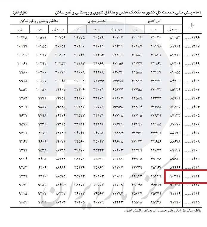 طبق اعلام مرکز آمار ایرانبر اساس اعلام مرکز آمار ایران، طبق پیش بینی انجام شده در سال ۱۴۱۲ جمعیت کشور از ۹۰ میلیون نفر عبور خواهد کرد.