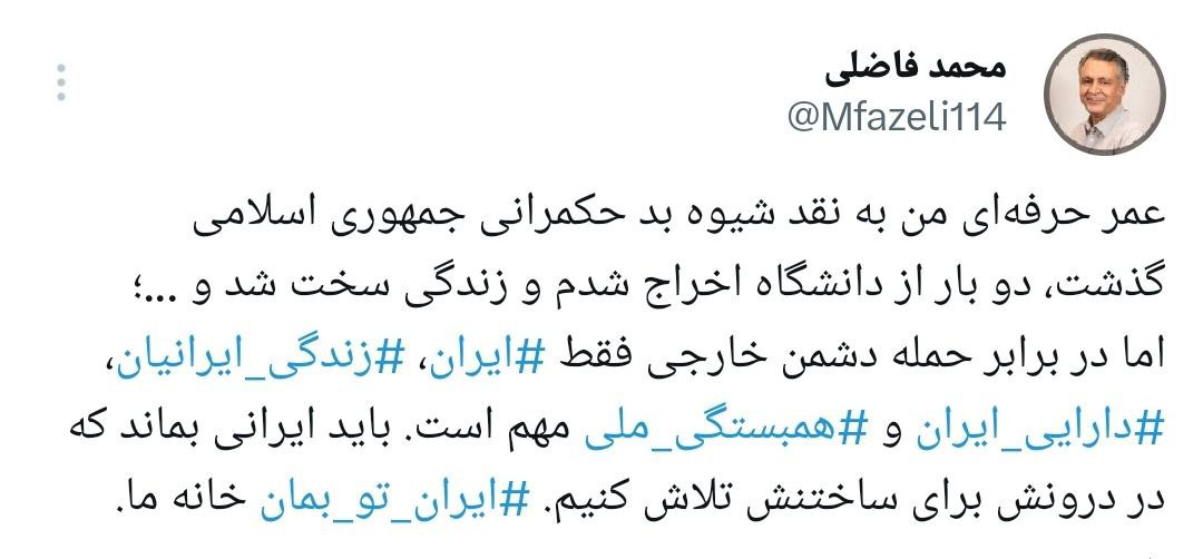 محمدفاضلی جامعهشناس ایرانی نیز در ایکس نوشت: دوبار از دانشگاه اخراج شدم و زندگی سخت شد. اما در برابر حمله دشمن خارجی فقط ایران، زندگی ایرانیان، دارایی ایرانیان و همبستگی ملی مهم است.