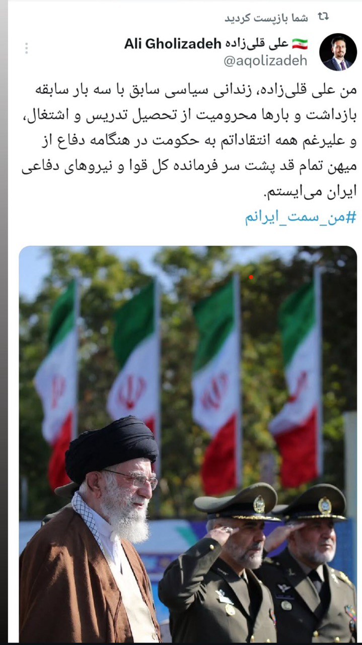 علی قلیزاده؛ فعال سیاسی نوشت: من با سابقه سه بار بازداشت و بارها محرومیت از تحصیل و تدریس و اشتغال تمام قد پشت سر فرمانده کل قوا و نیروهای دفاعی ایران میایستم.