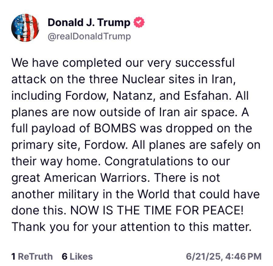 دونالد ترامپ، رئیس جمهور آمریکا هم مدعی شد آمریکا به سایتهای هستهای فردو، نطنز و اصفهان حمله کرده است. صفحه شخصی ترامپ در تروث سوشال دقایقی پس از انتشار خبر تجاوز آمریکا به مراکز هستهای ایران از دسترس خارج شد!