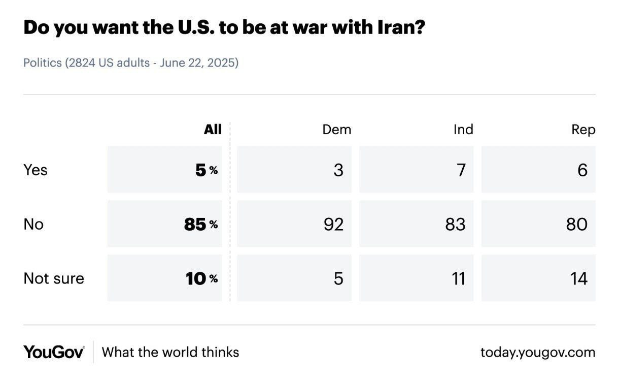 مطابق نظرسنجی جدید موسسه معتبر «YouGov»، بیش از 85% آمریکاییها در پاسخ به این سوال که آیا میخواهید ایالات متحده با ایران وارد جنگ شود؟ پاسخ منفی دادهاند. همچنین در این نظرسنجی تنها 5% مردم آمریکا پاسخشان به این سوال مثبت بوده است!