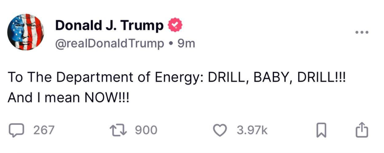 ترامپ در توییتی خطاب به وزارت انرژی آمریکا نوشت: حفاری کنید، عزیزان، حفاری کنید! و منظورم این است: همین حالا!