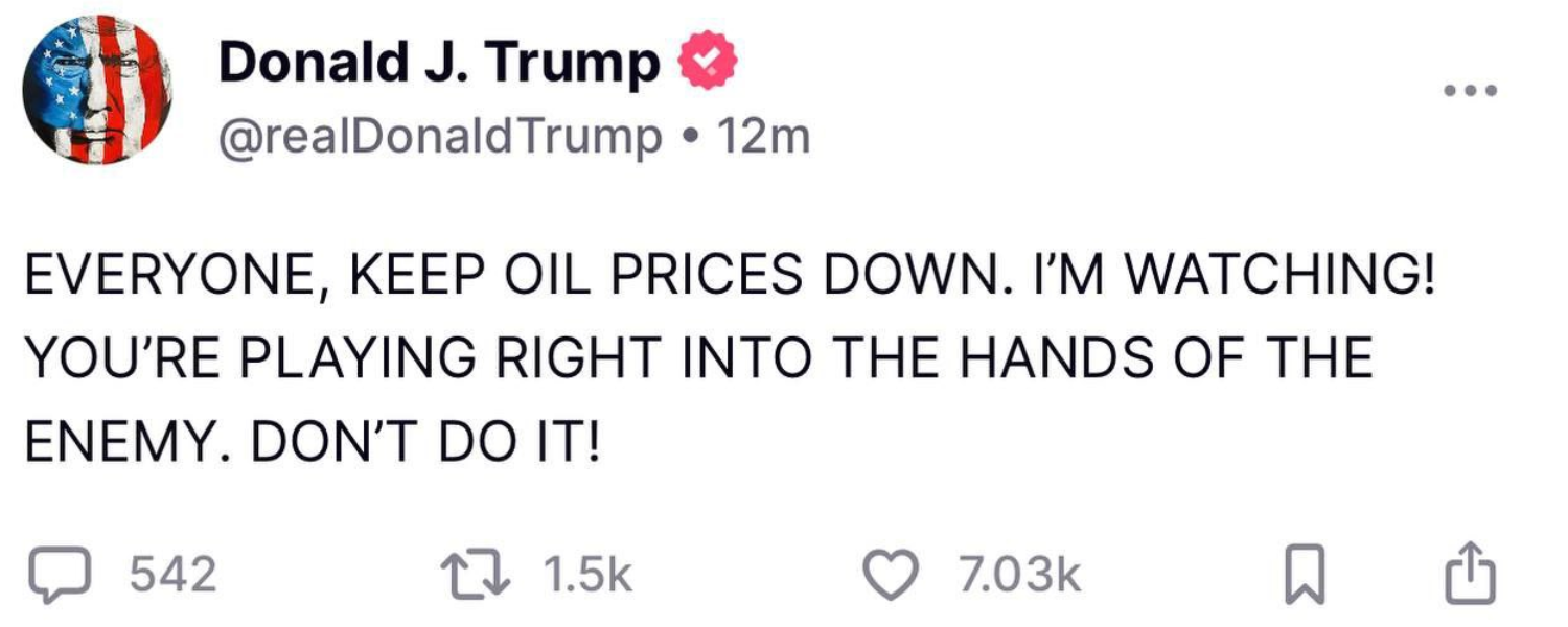 دونالد ترامپ، رئیس جمهور آمریکا در شبکه اجتماعی تروث سوشال نوشت: همه، قیمت نفت را پایین نگه دارید. من مراقب هستم! شما دارید درست به نفع دشمن بازی میکنید. این کار را نکنید!