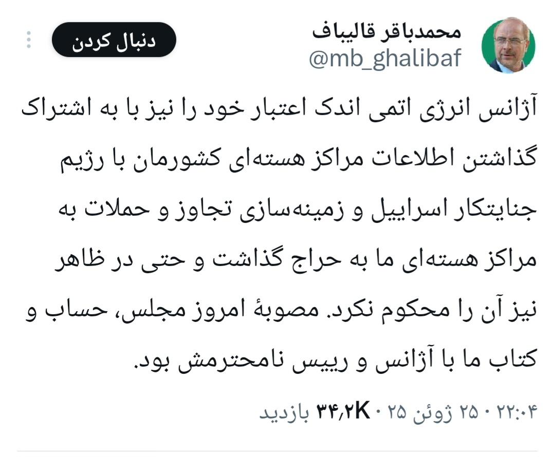محمدباقر قالیباف رئیس مجلس شورای اسلامی در حساب کاربری خود در شبکه اجتماعی ایکس (توئیتر سابق) نوشت: آژانس انرژی اتمی اندک اعتبار خود را نیز با به اشتراک گذاشتن اطلاعات مراکز هستهای کشورمان با رژیم جنایتکار اسرائیل و زمینهسازی تجاوز و حملات به مراکز هستهای ما به حراج گذاشت و حتی در ظاهر نیز آن را محکوم نکرد.