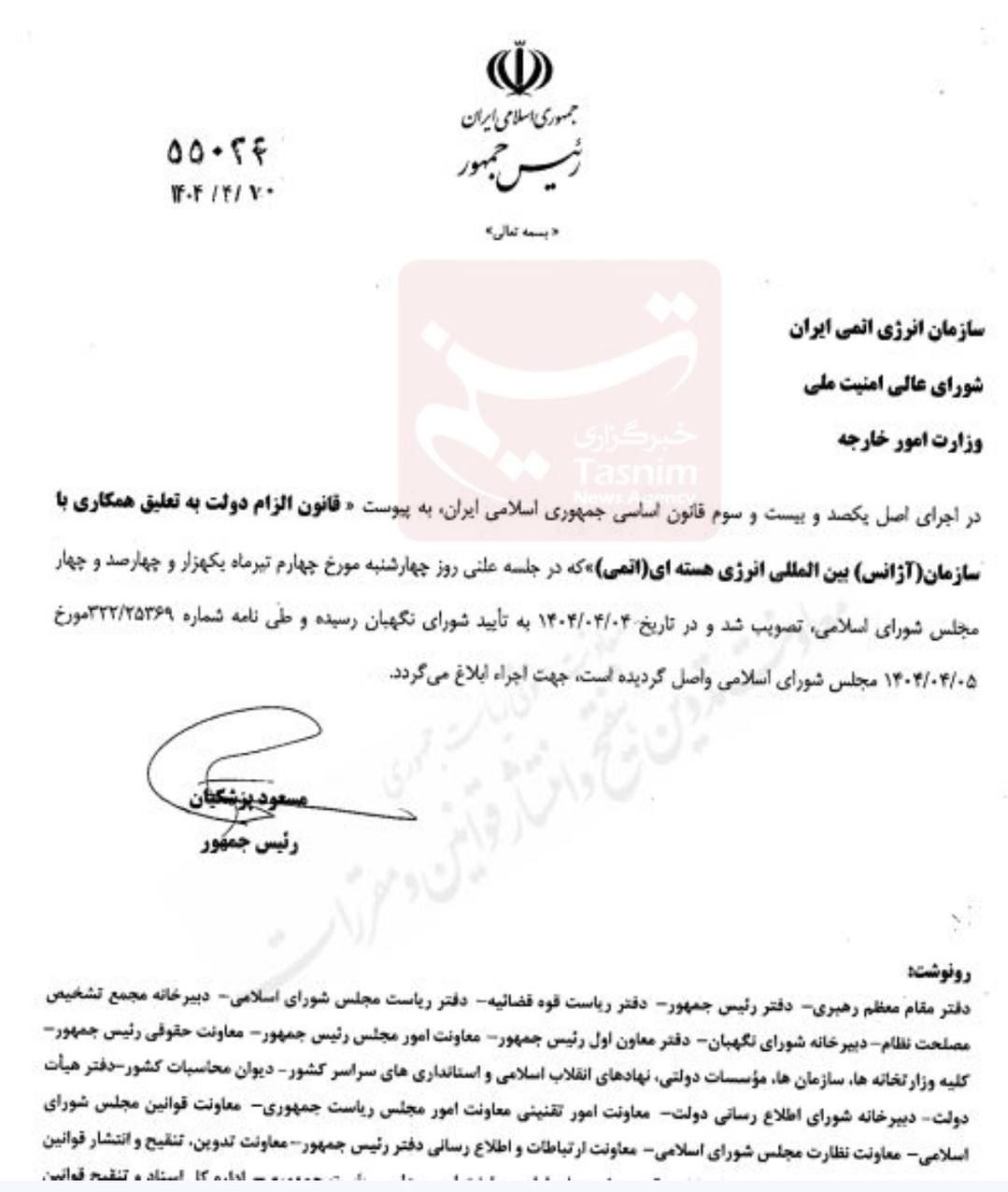 مسعود پزشکیان، رئیسجمهور قانون الزام دولت به تعلیق همکاری با سازمان (آژانس) بینالمللی انرژی هستهای (اتمی) را که در جلسه علنی مورخ 1404/04/04 مجلس شورای اسلامی به تصویب رسید طی نامه شماره 55024 مورخ 1404/04/10 ابلاغ کرد.