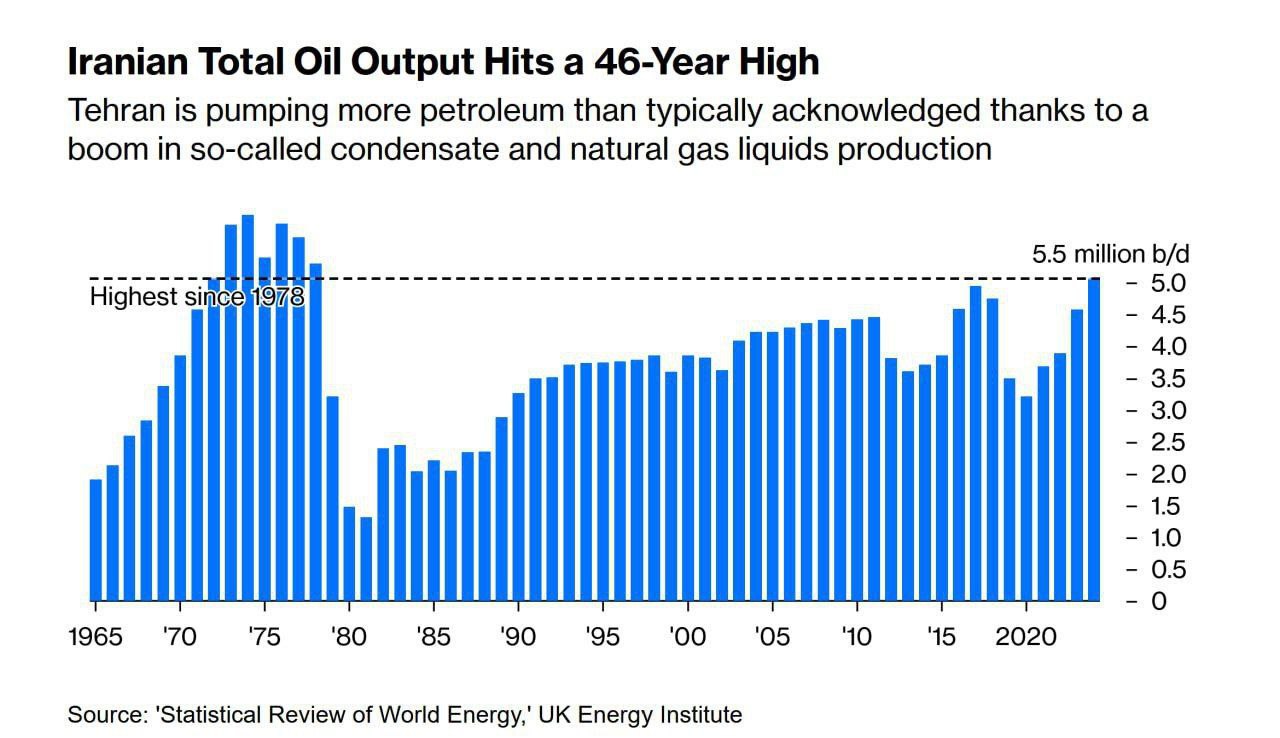 بلومبرگ: اکنون به جای «فشار حداکثری» ، «تولید حداکثری» رخ داده!طبق بررسی «فرهیختگان»، از گزارش موسسه انرژی بریتانیا، تولید نفت خام و میعانات گازی ایران در سال ۲۰۲۴ به ۵.۱ میلیون بشکه در روز رسید که بالاترین سطح در ۴۶ سال اخیر است.