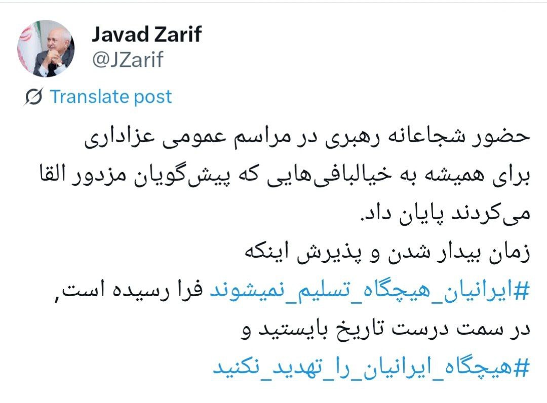 محمدجواد ظریف در پستی در شبکه اجتماعی ایکس نوشت: حضور شجاعانه رهبری در مراسم عمومی عزاداری برای همیشه به خیالبافیهای که پیشگویان مزدور القا میکردند، پایان داد.