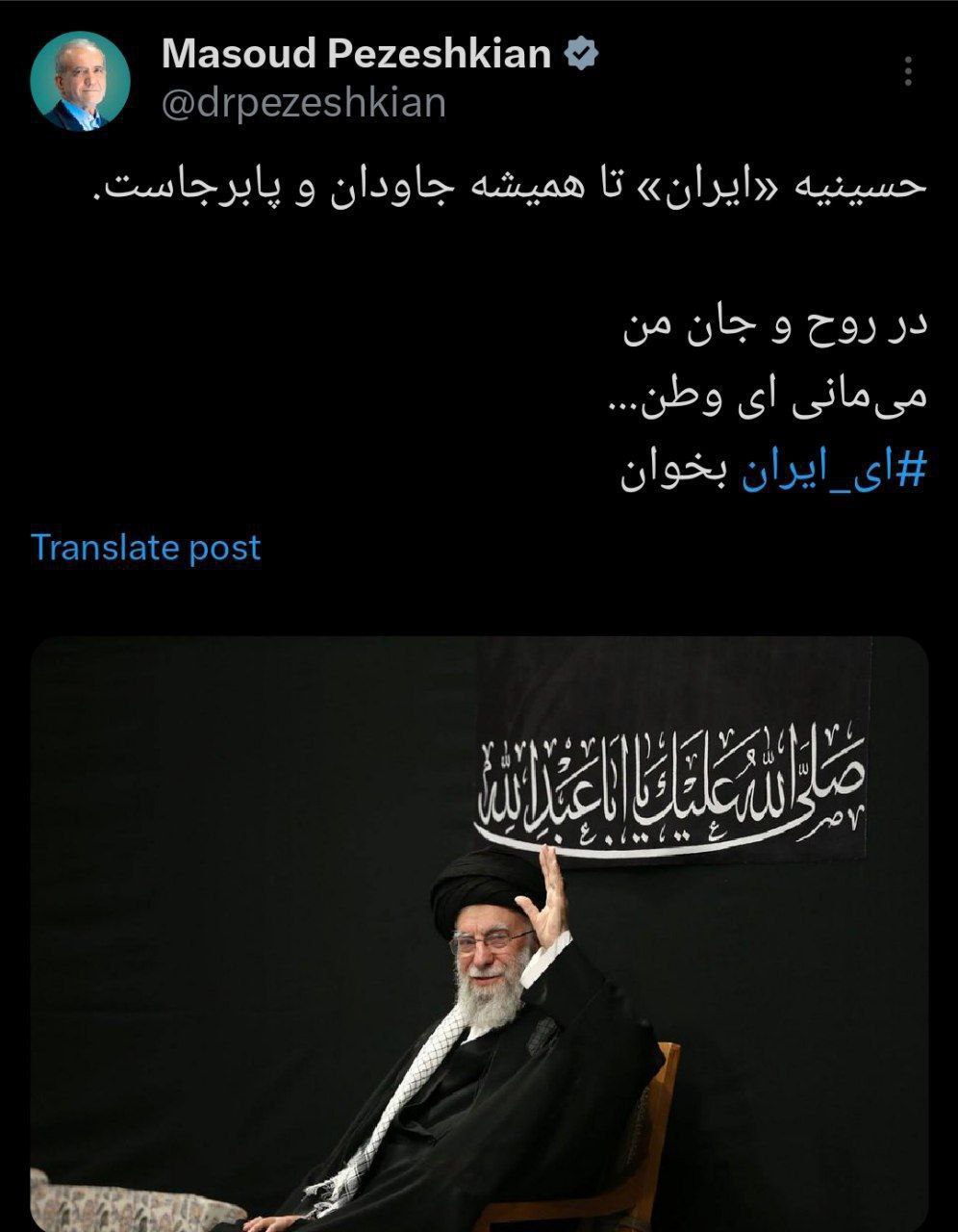 رئیسجمهور در شبکه اجتماعی ایکس در واکنش به حضور رهبر انقلاب در مراسم عاشورای حسینیه امام خمینی نوشت: حسینیه ایران تا همیشه جاودان و پابرجاست.