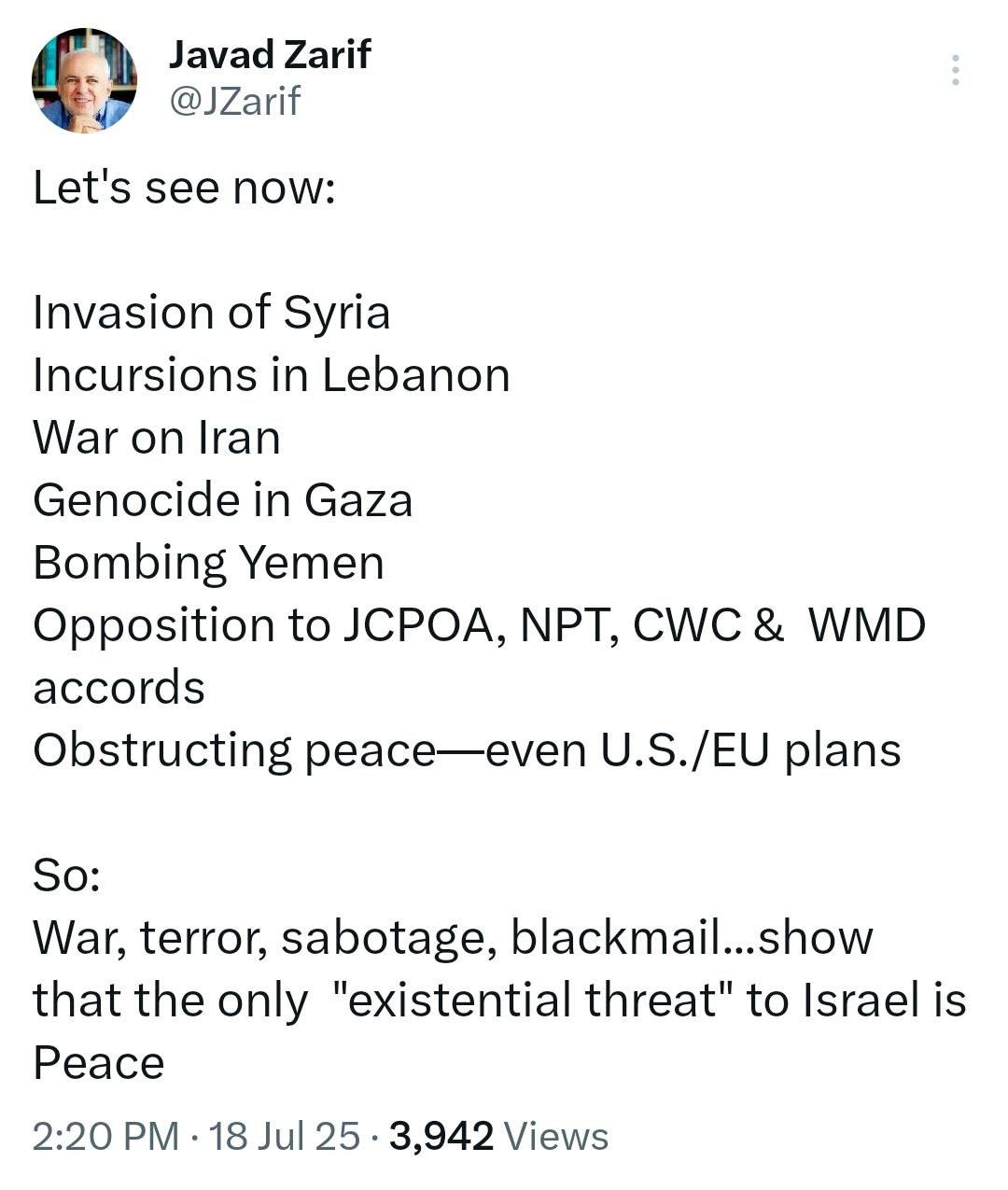 محمد جواد ظریف، وزیر خارجه پیشین جمهوری اسلامی ایران در مطلبی در شبکه اجتماعی ایکس با اشاره به جنایت های رژیم صهیونسیتی در منطقه غرب آسیا نوشت: «بیایید ببینیم: حمله به سوریه،تهاجم به لبنان،جنگ علیه ایران،نسل کشی در غزه، بمباران یمن، مخالفت با برجام، ان پی تی، کنوانسیون منع سلاحهای شیمیایی و دیگر معاهدات سلاحهای کشتار جمع و جلوگیری از صلح حتی طرحهای ایالات متحد و اتحادیه اروپا.»