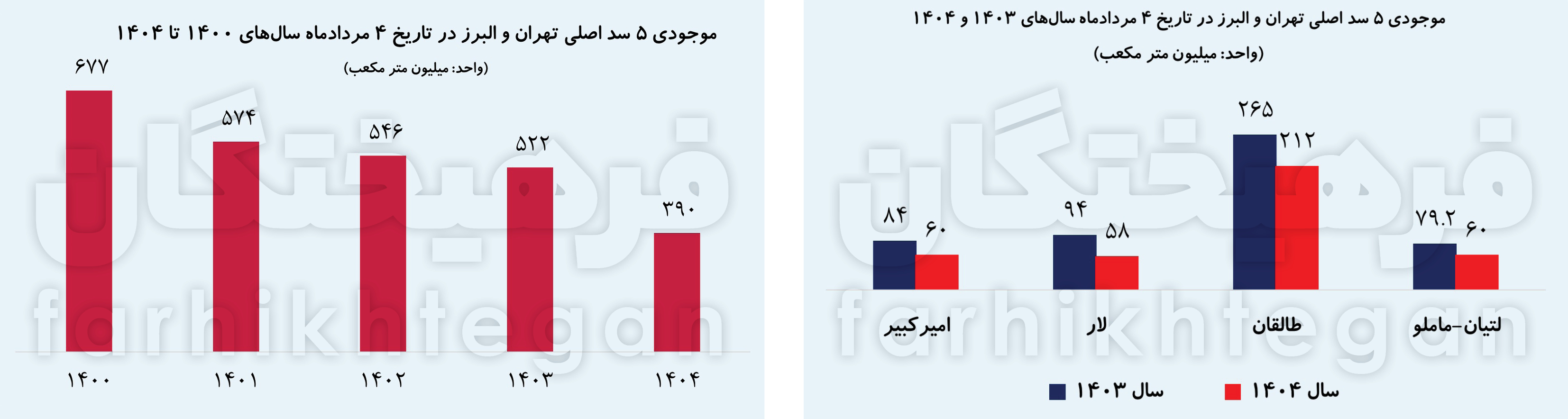 وقتی اقتصاد آب را متلاشی کردیمبر اساس جدول ارائهشده موجودی آب در ۵ سد اصلی استانهای تهران و البرز (بر اساس دادههای مربوط به ۴ مردادماه در هر سال) طی پنج سال اخیر روندی کاملاً نزولی را طی کرده است.