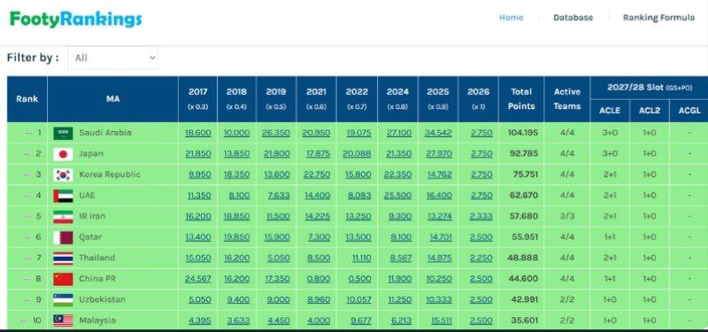 فوتی رنکینگ ردهبندی جدید لیگهای فوتبال آسیا را اعلام کرد که لیگ برتر ایران با یک پله صعود به رده پنجم آسیا صعود کرد. این صعود به معنای افزایش سهمیه فوتبال ما در فصل ۲۰۲۷-۲۰۲۸ لیگ نخبگان آسیا از ۱+۱ به ۱+۲ است. پیش از این قطر در رده پنجم قرار داشت.