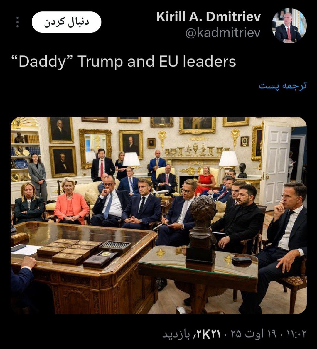 کریل دمیتریف، رئیس صندوق سرمایه گذاری روسیه در واکنشی کنایهآمیز به دیدار ترامپ و رهبران اروپایی تصویری منتشر کرد و نوشت: «بابا ترامپ و رهبران اروپا!»