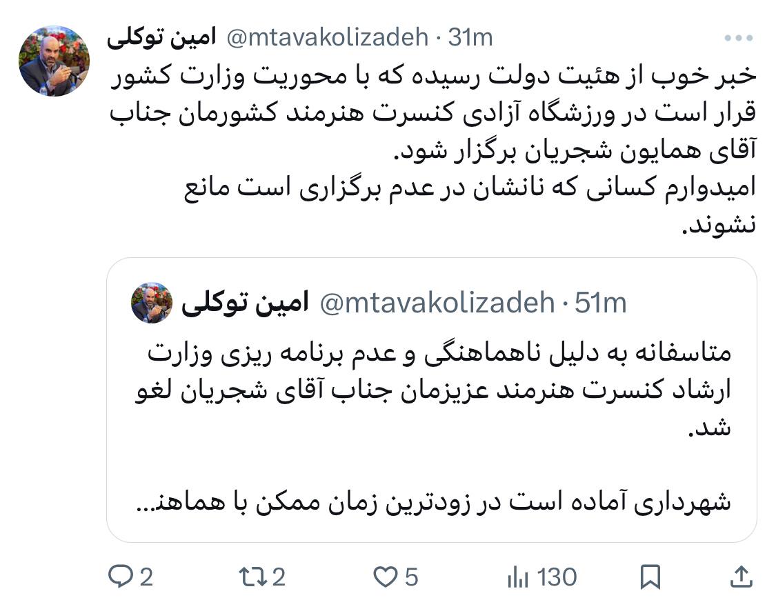 توکلی زاده با بیان اینکه بر اساس آنچه دریافتم، یا به دلیل فقدان تجربه برخی مسئولین جدید در معاونت هنری وزارت ارشاد در برگزاری رویدادهای میدانی، مقدمات به‌ درستی فراهم نشده بود و یا برخی با نگاهی سیاسی و رسانه‌ای قصد دارند قصور خود را به گردن شهرداری تهران بیندازند، افزود: عملیات رسانه‌ای علیه شهرداری در فضای مجازی، گمانه دوم را تقویت می‌کند و در پایان، وظیفه خود می‌دانم بار دیگر از تصمیم شایسته جناب آقای همایون شجریان، هنرمند گرانقدر کشورمان، قدردانی کنم. ایستادگی ایشان در برابر هجمه‌ها ستودنی است و این نگاه والا در خاطر ملت ایران ماندگار خواهد ماند.