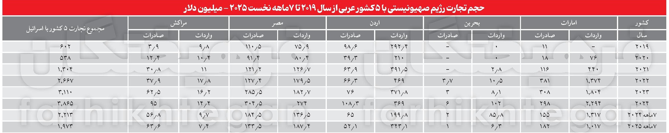 براساس گزارش‌های سازمان مرکزی آمار اسرائیل، علی‌رغم تشدید جنگ ویرانگر این رژیم علیه مردم غزه، تجارت بین اسرائیل و پنج کشور عربی شامل امارات، مصر، بحرین، اردن و مراکش طی سال‌های اخیر افزایش چشمگیری داشته است. براساس این داده‌ها، در سال 2019 مجموع تجارت این 5 کشور عربی با رژیم صهیونیستی حدود 602 میلیون دلار بوده که نزدیک به 50 درصد از آن مربوط به واردات اسرائیل از اردن بوده است. با این حال این مقدار در سال‌های بعد رشد چشمگیری داشته و طی سال‌های 2020، 2021؛ 2022، 2023 و 2024 به ترتیب 538 میلیون دلار، 1.3 میلیارد دلار، 2.7 میلیارد دلار، 3.1 میلیارد دلار و 3.9 میلیارد دلار بوده است. همچنین در 7ماهه نخست امسال این مقدار حدود 2 میلیارد دلار بوده که کاهش اندکی نسبت به رقم 2.2 میلیارد دلاری مدت مشابه سال گذشته داشته است.