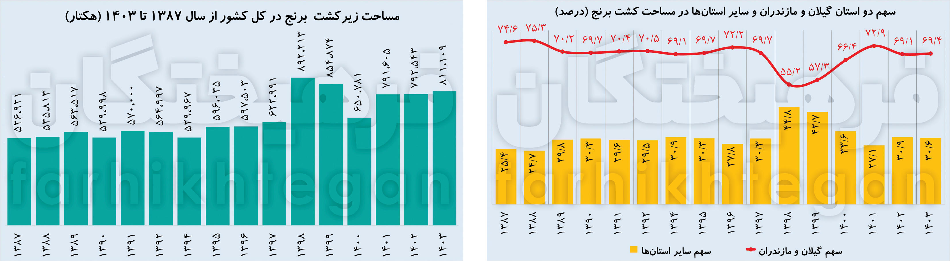 بررسیها از آمار وزارت جهاد کشاورزی حاکی از آن است که مساحت زیر کشت برنج و شلتوک در کل کشور طی 16 سال اخیر، بیش از 53 درصد رشد کرده و از حدود 527 هزار هکتار در سال 1387 به 811 هزار و 109 هکتار در سال 1403 رسیده است. البته که در برخی سالها در این 16 سال طبیعتاً مساحت زیر کشت برنج در استانهای ایران احتمالاً به بیش از این مقدار نیز رسیده است. اوج این افزایش مساحت زیر کشت برنج و شلتوک در سال 1398 و 1399 رخ داد که دولت مصوب کرد عمده کشت برنج در استانها پرآب مانند مازندران و گیلان صورت گیرد و کشت برنج در سایر استانهای کمآب ممنوع شود و در برخی استانهای دیگر نیز با اعمال محدودیت همراه شود و البته از طرفی دیگر میزان بارشها در سراسر کشور افزایش یافت؛ این شد که مساحت زیر کشت برنج در کشور به 892 هزار هکتار و 854 هزار هکتار در سالهای 1398 و 1399 رسید. گفتنی است 70 درصد تولید برنج تنها در دو استان گیلان و مازندران بوده و 30 درصد باقی مانده در استانهای غیرشمالی صورت گرفته است.