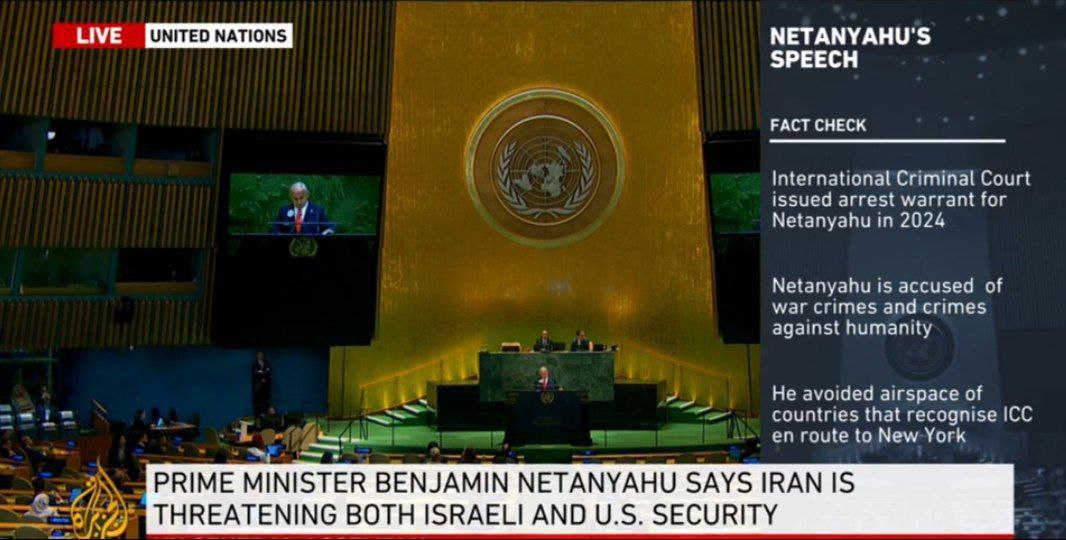هنگامی که نخست وزیر رژیم درحال دفاع از اقدامات اسرائیل در غزه بود، الجزیره بیان کرد که دادگاه کیفری بینالمللی (ICC) در سال ۲۰۲۴ حکم دستگیری نتانیاهو را صادر کرده است و نتانیاهو به ارتکاب جنایات جنگی و جنایات علیه بشریت متهم است.