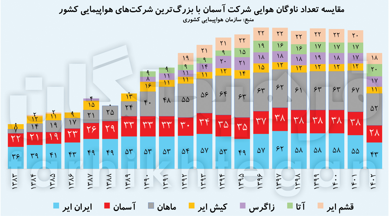 گزارش تحقیقی فرهیختگانطبق اطلاعات صورت مالی شرکت، آسمان دارای ۴۵ فروند هواپیما بوده که بخشی از آنها غیرفعال بوده و ۲۸ فروند از آن نیز بهدلیل کمبود قطعه یا عدم دریافت مجوز پرواز، زمینگیر شدهاند.