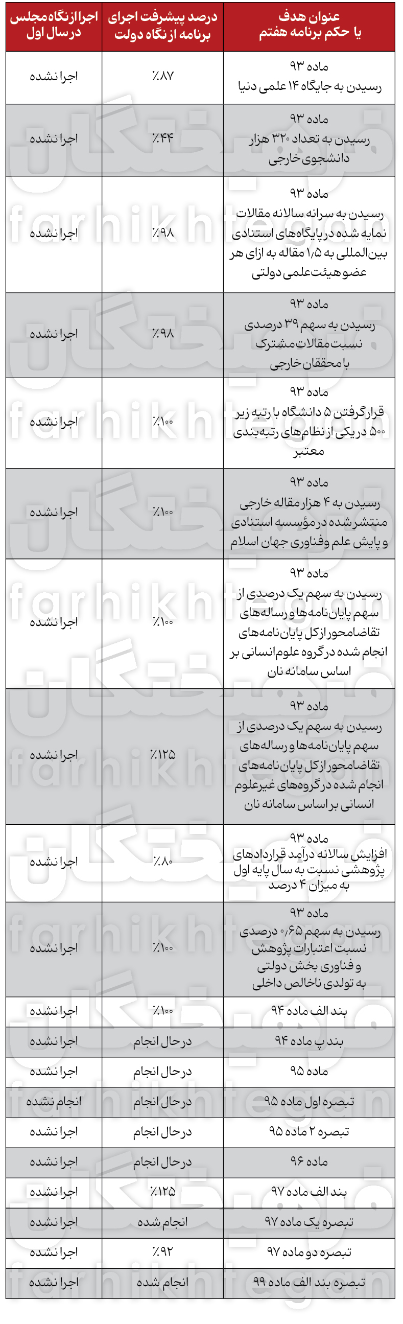 تجربه اجرای نصفه‌ونیمه برنامه‌های توسعه‌ای اول تا ششم باعث شد تا تدوین‌کنندگان برنامه هفتم، سازوکار‌هایی را برای تأمین حسن نظارت بر قانون پیش‌بینی کنند. بر همین اساس شورای عالی راهبردی برنامه مکلف شد تا شهریور ماه هر سال، گزارشی از عملکرد اجرای این قانون تهیه و به مجلس ارائه دهد. گزارشی که 28 شهریور معاون اول رئیس‌جمهور به مجلس ارائه کرد، حالا محل نقد و نظر نمایندگان در کمیسیون‌ها مختلف شده است. احسان عظیمی‌راد، سخنگوی کمیسیون آموزش پس از نشست کمیسیون متبوعش درخصوص برنامه هفتم عملکرد وزارت علوم در این حوزه را رضایت‌بخش ندانسته است. به گفته او، به‌صورت میانگین از هر ماده یک بند اجرایی شده و نسبت به بند‌های اجرا شده نیز ابهاماتی وجود دارد. «فرهیختگان» پیش‌تر در گزارشی با عنوان «۷۵ درصد برنامه هنوز روی کاغذ» که 18 مرداد ماه منتشر شد، به تفصیل به روند اجرای برنامه هفتم پرداخته و بند‌های مختلف فصل بیستم این برنامه را مورد واکاوی قرار داده بود. گزارش مرکز پژوهش‌های مجلس که این هفته منتشر شده هم نشان می‌دهد که بخش‌های قابل‌توجهی از احکام فصل بیستم این برنامه محقق نشده است. در این گزارش با بررسی وضعیت 37 حکم، مشخص شده که عملاً بخش مهمی از احکام و اهداف برنامه در حوزه علمی، فناوری و پژوهشی اجرایی نشده است.