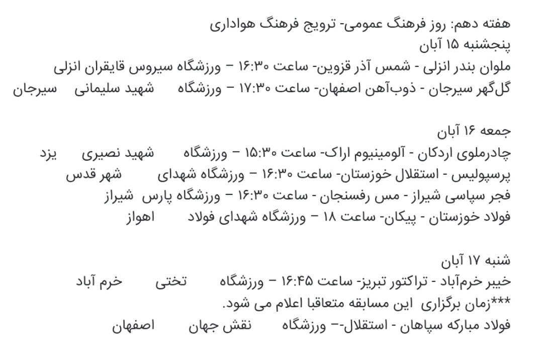 همچنین در روزهای ۲۹ و ۳۰ آبان و اول آذر یعنی در حد فاصل پایان فیفادی و هفته یازدهم لیگ برتر، دیدارهای مرحله یک شانزدهم نهایی جام حذفی با حضور تیم های لیگ برتری برگزار می شود. به همین دلیل مسابقات هفته یازدهم از تاریخ ۷ آذر ماه آغاز خواهد شد.