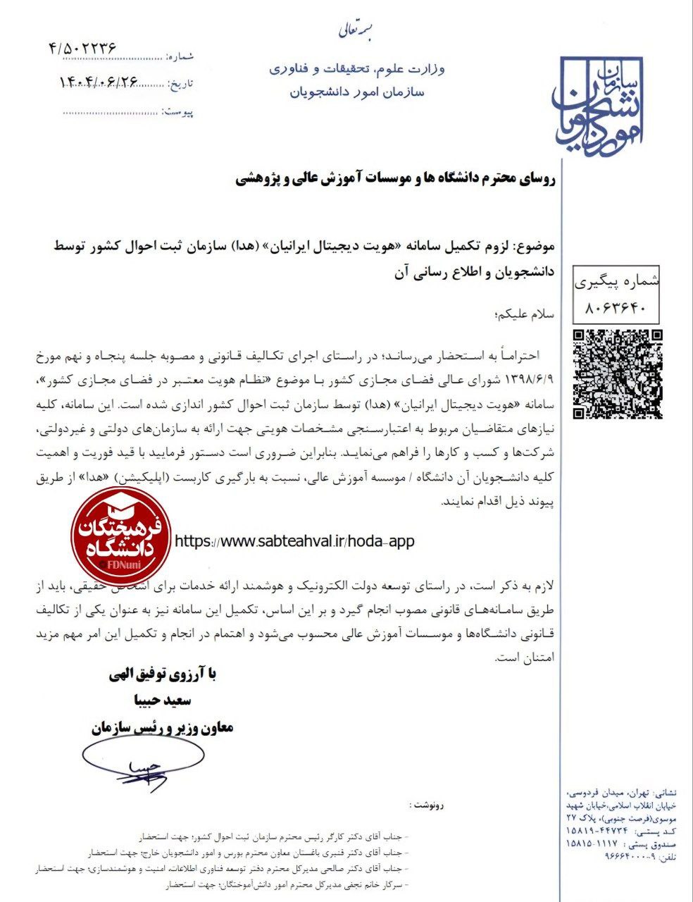 در نامهای خواسته شدسازمان امور دانشجویان وزارت علوم، تحقیقات و فناوری از همه دانشجویان سراسر کشور خواست تا با نصب و بهکارگیری اپلیکیشن «هدا»، در مسیر تحقق دولت هوشمند مشارکت کنند.