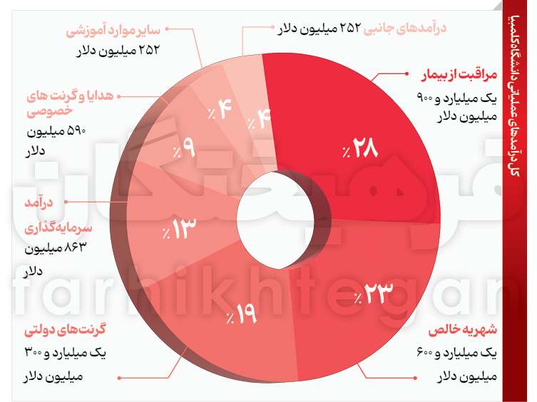 درآمد حاصل از مراقبت از بیمار (شامل مراقبتهای بالینی ارائهشده در مطب پزشکان و نیز خدمات ارائهشده در مراکز بستری وابسته) با سهم یک میلیارد و 900 میلیون دلاری، 28 درصد از کل درآمدهای این دانشگاه را به خود اختصاص میدهد، همچنین خالص شهریه دانشجویان نیز حدود یک میلیارد و 600 میلیون دلار به درآمد دانشگاه کمک میکند که سهم 23 درصدی را دارد و رشد 4.1 درصدی نسبت به سال قبل را نشان میدهد. اگر میزان درآمد دانشگاه کلمبیا را از خالص شهریه به دلار 107 هزار تومانی حساب کنیم که چیزی حدود 171 هزار و 200 میلیارد تومان (171 همت) میشود؛ دانشگاه کلمبیا یکی از گرانترین دانشگاههای آمریکا برای تحصیل است، اگرچه به دانشجویانی که از خانوادههایی با درآمد کمتر از 150 هزار دلار در سال هستند، شهریه رایگان ارائه میدهد.