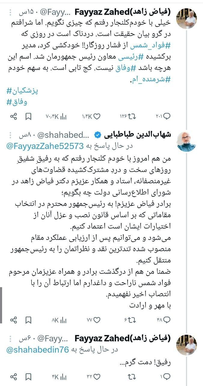 فرهیختگان: اختلاف در شورای اطلاع رسانی دولت که از مدتی پیش آغاز شده بود حالا به استعفای یکی از اعضای این شورا رسیده. فیاض زاهد، عضو شورای اطلاع‌ رسانی دولت، در اعتراض به آنچه انتصاباتِ وفاقیِ پزشکیان می‌دانست از دولت استعفا و الیاس حضرتی رئیس شورا هم با این جدایی موافقت کرد.