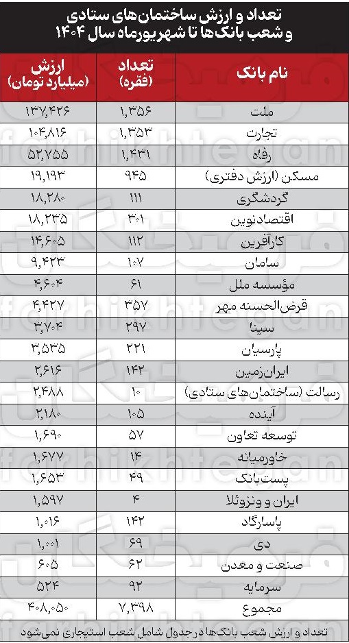 بسیاری از ساختمانهای اداری و شعب بانکها به دلایل مختلف میتواند در ردیف ساختمانهای لوکس دستهبندی شوند. ساختمانهایی که نگهداری آنها علاوه بر فریز کردن منابع قابلتوجهی در بخش ساختمان، هزینه خرید یا اجاره بسیار بالا، هزینه نگهداری و تعمیرات کلان و هزینه انرژی (برق، گاز) بسیار زیاد را به بانک تحمیل میکنند. بر اساس دادههایی که در جدول آمده، مجموع ارزش تعداد 23 بانک مؤسسه مالی در پایان شهریور سال 1404 حدود 408 هزار میلیارد تومان است.