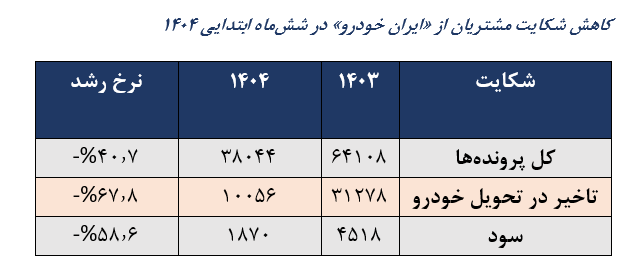 «ایران خودرو» از کاهش ۴۱درصدی شکایات مردمی از این مجموعه در شش ماه ابتدایی سال خبر داد. بزرگترین خودروسازی کشور اعلام کرد از ابتدای فروردین ۱۴۰۴ تا پایان شهریور، ۲۶هزار پرونده کمتر از مدت مشابه سال گذشته تشکیل شده و از ۶۴ هزار به ۳۸ هزار پرونده رسیده است.
