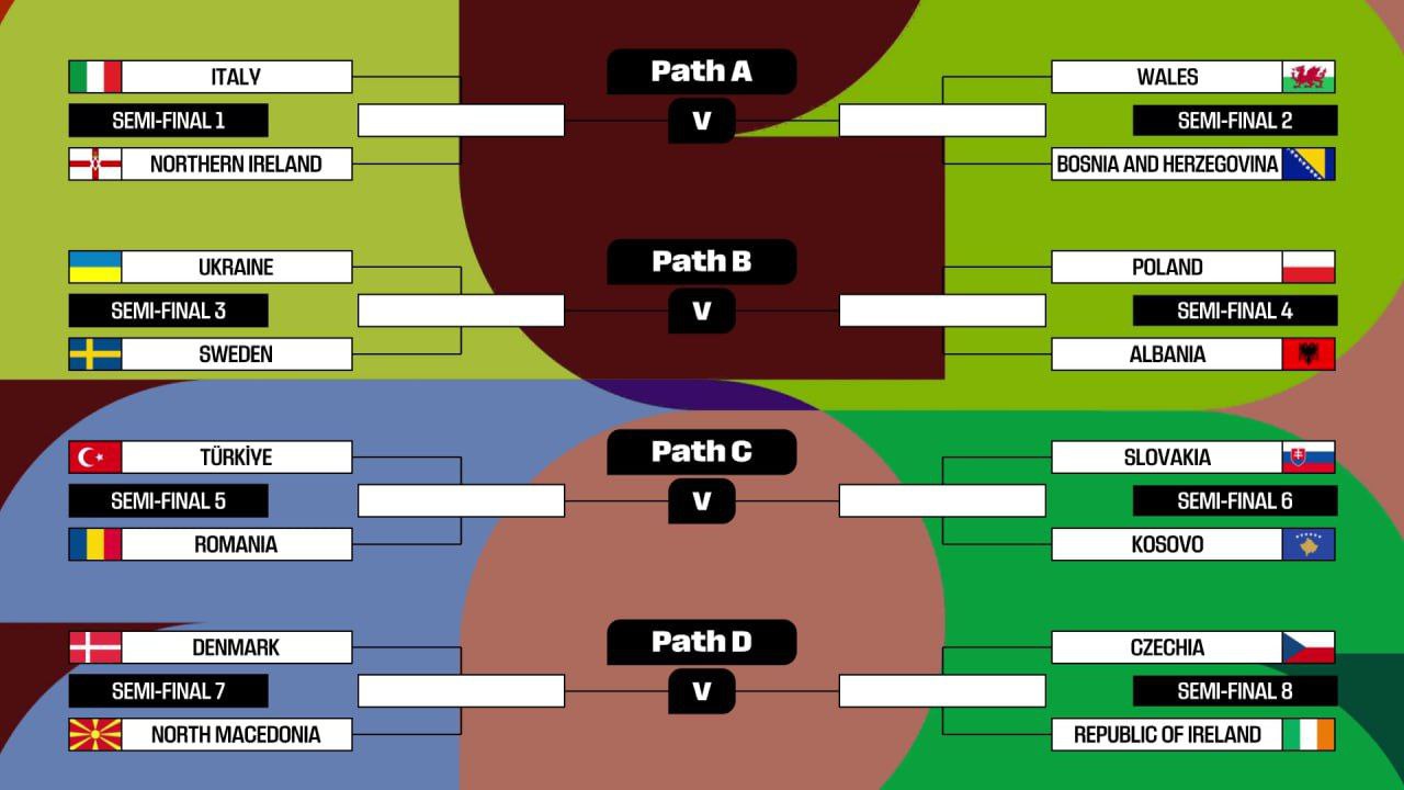بر این اساس در مسیر اول، ایتالیا با ایرلند شمالی مواجه میشود و برنده این بازی به مصاف فاتح جدال ولز و بوسنی میرود.