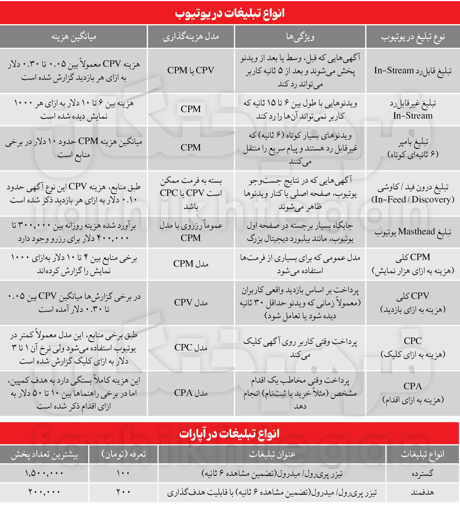 مدل تبلیغات یوتیوب روی چهار مفهوم اصلی بنا شده:CPM برای زمانی که برند به دنبال دیده‌شدن گسترده است، CPV برای مواقعی که کیفیت بازدید و تماشای واقعی اهمیت دارد،CPC برای کمپین‌هایی که نیاز به جذب کلیک دارند و CPA زمانی که هدف، رسیدن به یک اقدام مشخص مثل خرید یا ثبت‌نام است. کنار این مدل‌های هزینه‌گذاری، یوتیوب طیف متنوعی از فرمت‌های تبلیغاتی را ارائه می‌کند؛ از In-Stream قابل‌رد که کاربران بعد از ۵ ثانیه می‌توانند آن را رد کنند، تا نسخه غیرقابل‌ردی که ۶ تا ۱۵ ثانیه فرصت دارد پیام را کامل منتقل کند. تبلیغات بامپر با طول ۶ ثانیه، گزینه‌ای سریع و مؤثر برای کمپین‌های کوتاه و به‌یادماندنی است و تبلیغات In-Feed نیز انتخابی مناسب برای برند‌هایی است که می‌خواهند کاربر داوطلبانه وارد صفحه ویدئو شود. در نهایت، فرمت جسورانه و گران‌قیمت Masthead مثل یک بیلبورد دیجیتال جهانی عمل می‌کند؛ جایی که برند‌ها برای یک روز حضور در صفحه اول یوتیوب گاهی تا یک میلیون دلار هزینه می‌کنند.