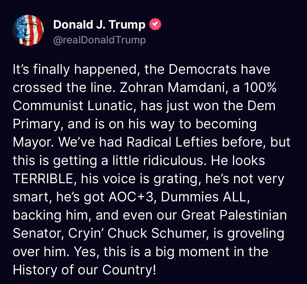 وی همچنین گفته بود: «بالاخره اتفاق افتاد، دموکراتها از خط قرمز عبور کردند. زهران ممدانی، یک دیوانهی صد در صد کمونیست، به تازگی در انتخابات مقدماتی دموکراتها پیروز شده و در مسیر شهردار شدن است. ما قبلاً چپهای رادیکال داشتهایم، اما این کمی مسخره شده است. او وحشتناک به نظر میرسد، صدایش گوشخراش است، خیلی باهوش نیست.»