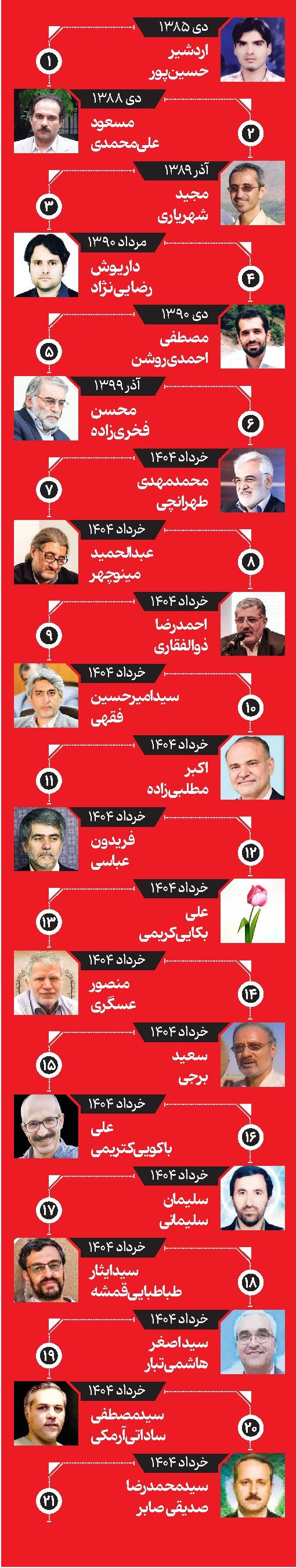 بنا به گزارش «فرهیختگان» تاریخچه ترور دانشمندان هستهای ایرانی که غالباً با کمک بمبهای مغناطیسی و به گلوله بستن همراه بوده، به دیماه 1385 برمیگردد؛ زمانی که نخستین دانشمند هستهای ایران یعنی اردشیر حسینپور به دست موساد به شهادت رسید. گفتنی است اسرائیل تا کنون بیش از 15 تن از دانشمندان هستهای کشور به شهادت رسانده است.