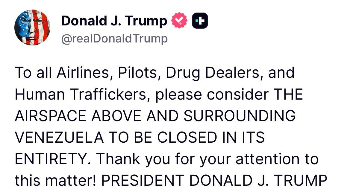 رئیس‌جمهور آمریکا هم‌زمان با حضور شمار زیادی از نیروها و تجهیزات نظامی این کشور در اطراف ونزوئلا، در پستی در شبکه‌های اجتماعی نوشت: «به اطلاع کلیه شرکت‌های هواپیمایی، خلبانان، قاچاقچیان مواد مخدر و شبکه‌های قاچاق انسان می‌رسد: از این پس کل حریم هوایی ونزوئلا و مناطق اطراف آن کاملاً بسته تلقی می‌شود.»